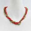 Make a bold statement with this coral and green pearl necklace, a beautifully twisted design that combines vibrant red coral beads with luminous green freshwater pearls. This handcrafted piece offers an eye-catching mix of textures and hues, creating a rich and dynamic accessory that brings elegance and personality to any outfit.
