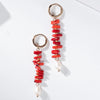 These red coral stones earrings with pearl combine the raw beauty of natural coral with the timeless elegance of freshwater pearls. Suspended from gold-tone hoops, each earring features irregular coral stones accented with dainty gold beads, ending in a lustrous pearl drop for a refined finish.