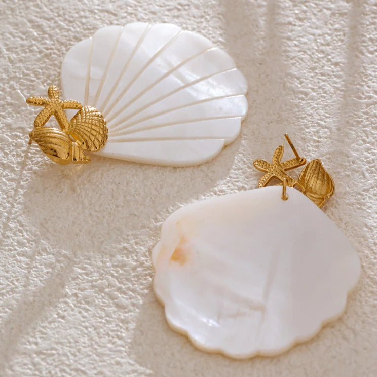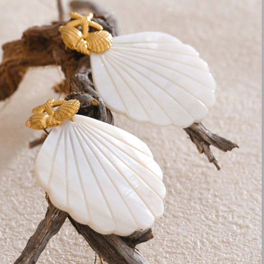 Inspired by seaside treasures, these white seashell earrings blend oceanic beauty with refined detail. The luminous shell fan is topped with a charming golden starfish and seashell motif for a playful, elegant twist. Lightweight yet impactful, they’re ideal for beach outings, tropical vacations, or sunny everyday glam.